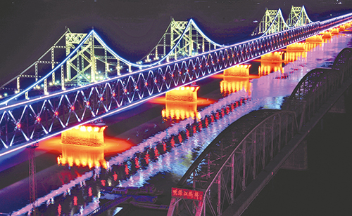 大桥亮化主要灯光内容有:大桥桥墩泛光照明,大桥桥体两侧X型钢梁的大功率LED投光染色灯的动态灯光常常渲演,大桥顶部中方侧四座斜峰的泛光照明。灯光运行与控制方面采用分时段,按季节,按节假日及重大庆典来进行不同灯光效果运行,投入相应的灯具工作。以达到灯具在运行时的节能