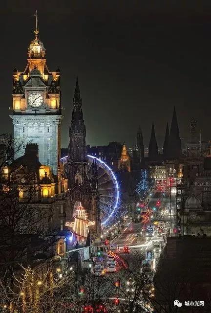 颜色和层次也会伴随着音乐的节奏而变化,伴着天空的烟火。爱丁堡的圣诞游乐场,