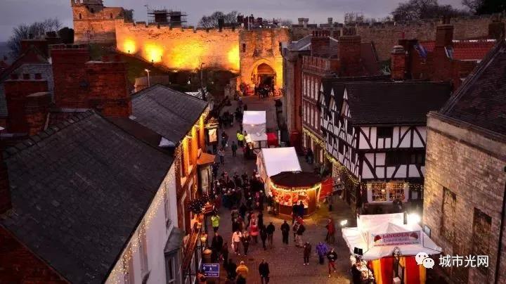 林肯的圣诞集市环绕着山间的城堡,夜晚望过去灯火辉煌。