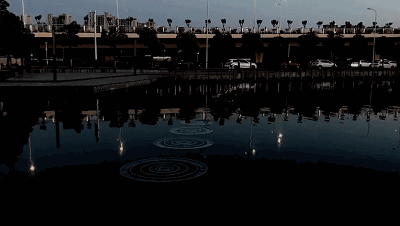 水中。光的水花时起时伏穿梭于水面划出优美的涟漪,它唤起了我们童年打水漂的记忆。