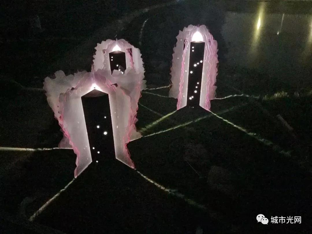水花采用网孔镜面不锈钢材料,白天反射天空形成水天一色,晚上通过