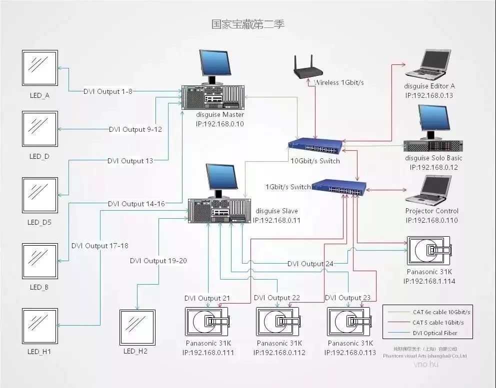 另1台作为伺服服务器,负责两块LED区域以及四台DVI画质的投影机的视频投放。