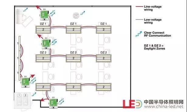 以符合大多数现行的能源法规。在一个具有与窗壁平行的三行灯具的教室中,第一行灯具通常在主要日光区域中,