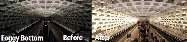 华盛顿地铁的照明设计采取了地下向上照明,通过屋顶反射,