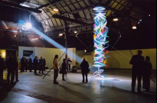 “黑暗物质”作品呈现为三维虹彩波形,色拉母光投射到快速旋转的绳索上,