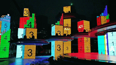 以地为台(晚会舞台),以城为景(多媒体楼体群),运用现代高科技的影像技术,例如通过多媒体视频、水屏幕、