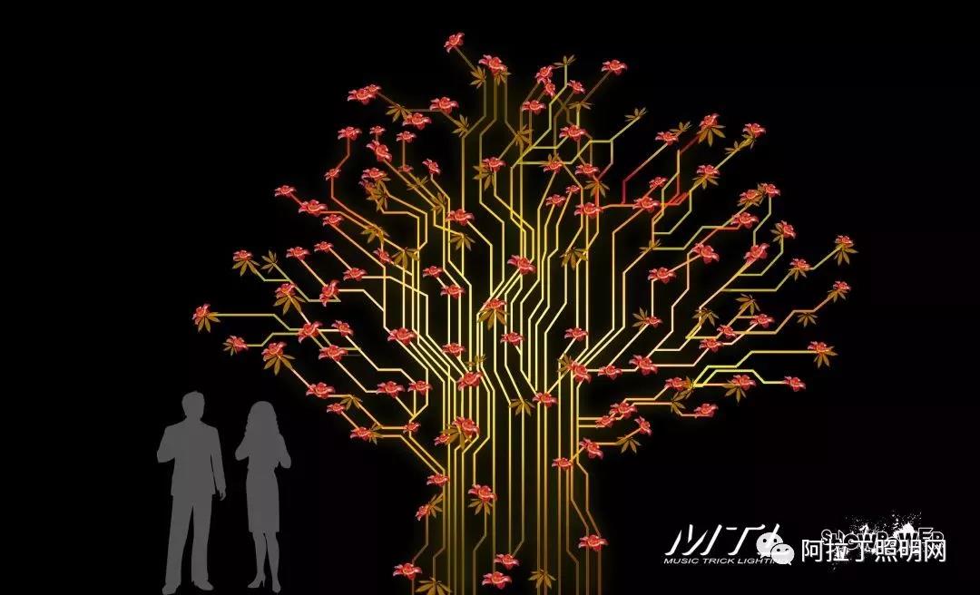 从某种角度上来看是一种电路板芯片的视觉效果,树叶采用了可以弯曲的柔性led屏幕,每片树叶可以单独控制变化,