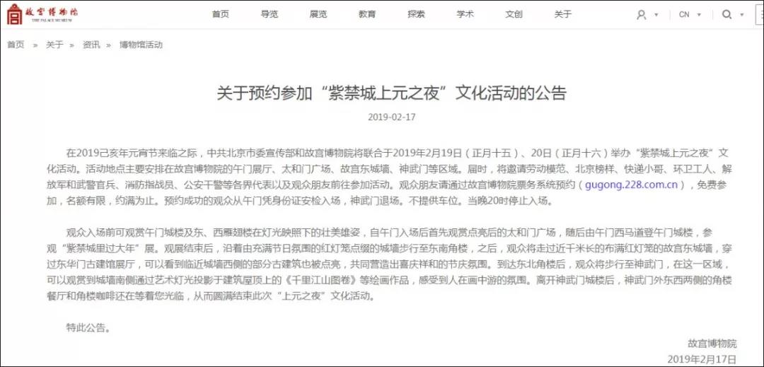 举办的“紫禁城上元之夜”文化活动,于2月19日(正月十五)和20日(正月十六)举行。