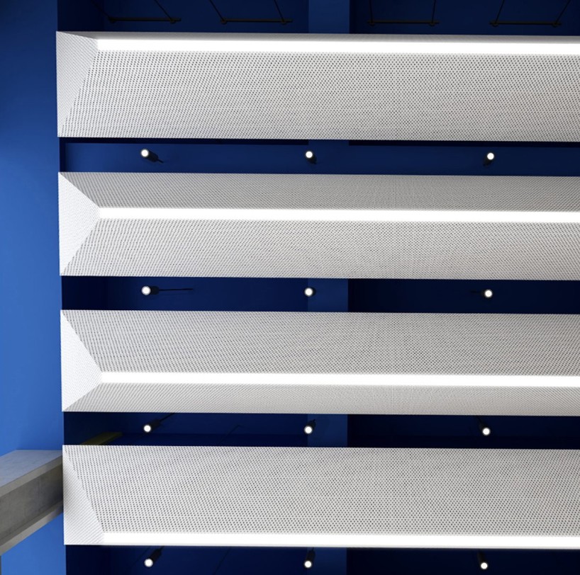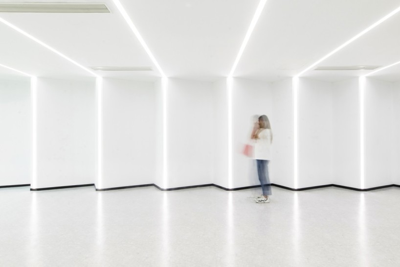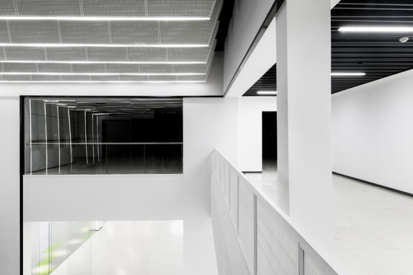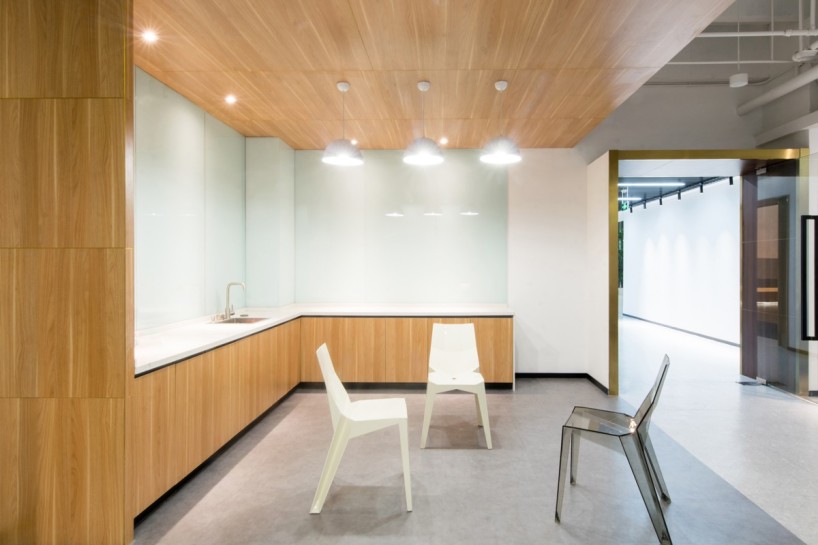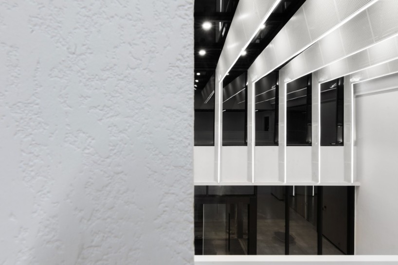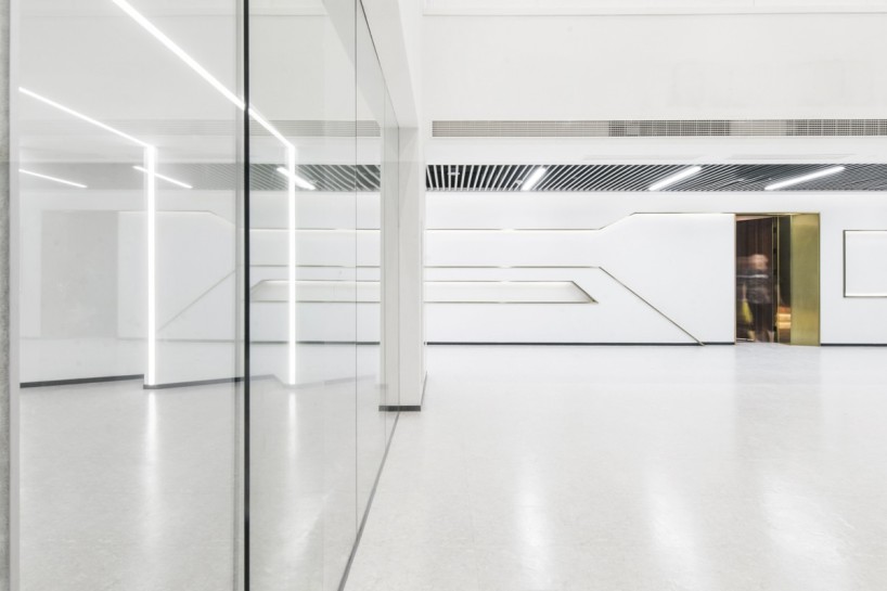 由于原场地为半透的玻璃建筑,且大堂顶部有裸露的玻璃构成,为了优化场地的采光环境,在大堂顶部加设有垂直百叶,光线透过玻璃时,根据不同时间不同季节的光照角度形成不同长宽的条形阴影,以此调节室内采光,避免室内光线太强或者遮挡过多影响室内外景观的通透性。同时,将原有的隔间打通,用落地玻璃替代原有的墙结构,构成开放式的办公空间,并将自然光线延伸至室内。解决了场地进深大、内部接触不到自然光的问题,最大限度地利用了自然资源。