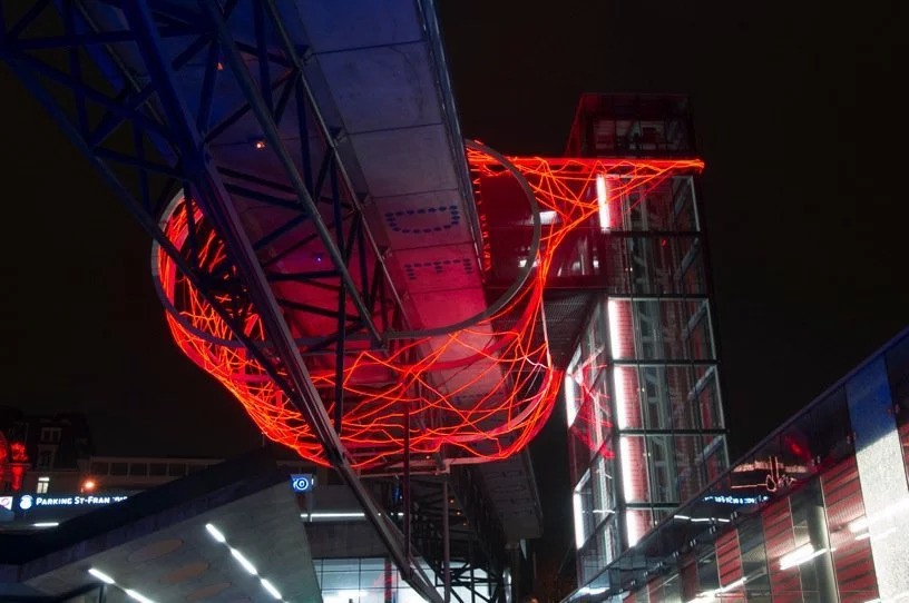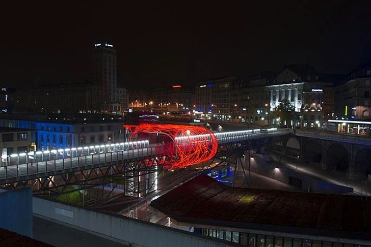 装置的框架结构是由线团的造型引申而来,它的形状像一捆红色毛线球,环绕着洛桑市中心的一座人行天桥。