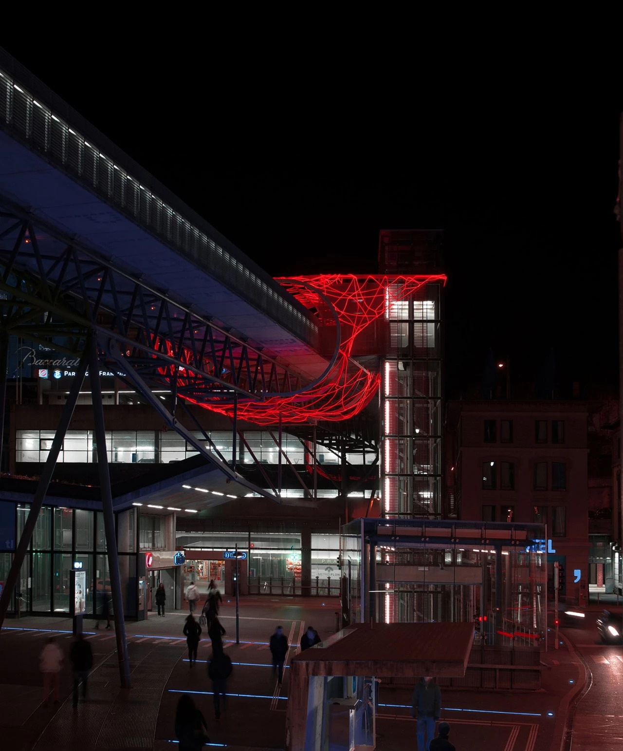 Flux Cocoon是为洛桑市首届lumières灯展设计建造的,是洛桑城市灯光节上的获奖项目之一,由Allegory设计,位于市中心一处垂直交通设施和水平设施的交汇处。