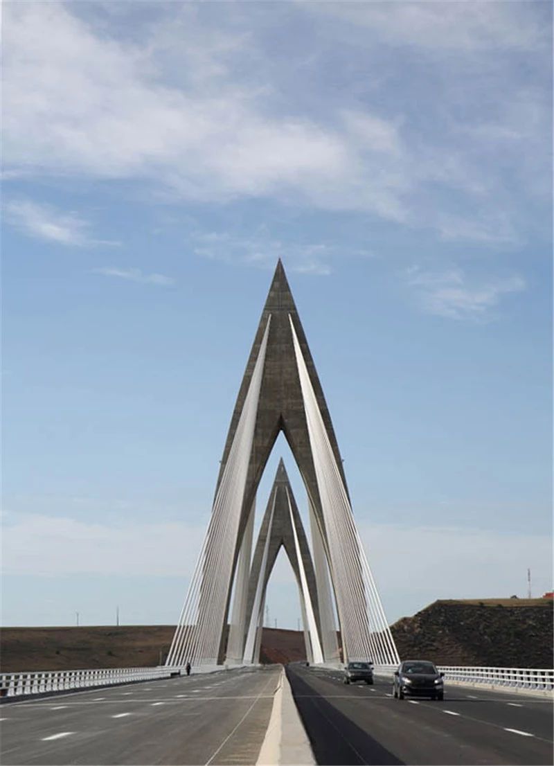 主塔采用四肢分离式空间曲线型混凝土结构;主梁采用边主梁结构,混凝土边主梁之间通过钢横梁连接,钢横梁上安装预制混凝土桥面板,主塔墩采用扩大基础。引桥为5跨40m预制T梁结构。大桥设计上的亮点就是两座主塔。主塔采用漂亮的钻石结构外形,由底部向上延伸呈弧形逐渐打开,在中部渐分为四支,至塔顶又合为一体。其设计具有典型的阿拉伯建筑特点,具有“胜利之门”、“理想之门”的寓意。