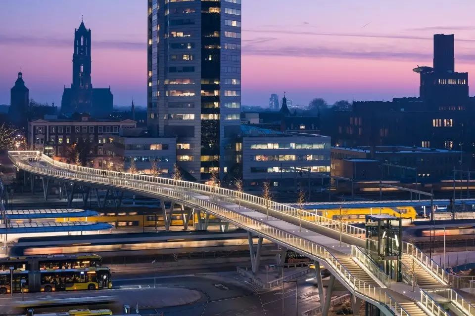 最近几年,乌特勒支火车站地区正经历着翻天覆地的变化。而在去年正式开放的Moreelsebrug步行桥在鳞次栉比的新建、修复、改造建筑中蜿蜒延伸,跨越繁忙的铁路,为骑行者与行人打通了连接Croeselaan与Moreelsepark的廊道。