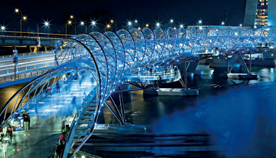 该桥也注重照明设计,夜晚,在灯光系统的照射下,螺旋桥呈现出华丽的效果。