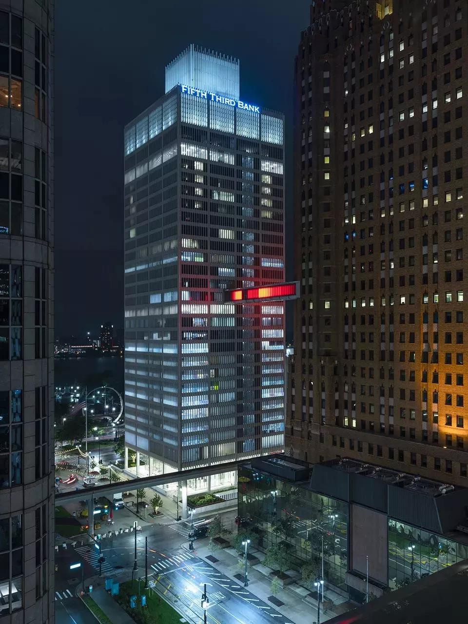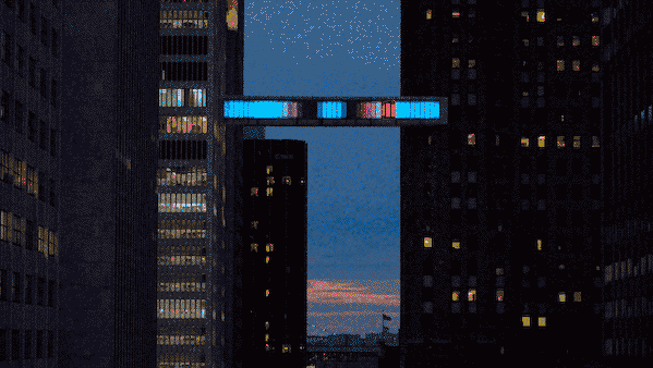 这条长达100英尺,位于建筑16层的走廊连接了One Woodward大厦和Guardian大厦这两座底特律最具标志性的建筑,在底特律市中心街道的上空形成一道悬浮的光梁。