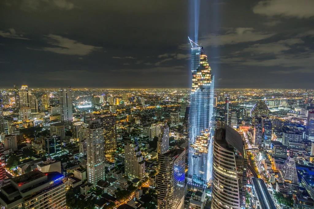 夜幕降临,这座建筑在灯光的照射下更加凸显。MaHaNakhon 独特的结构让灯光分布