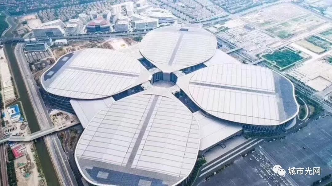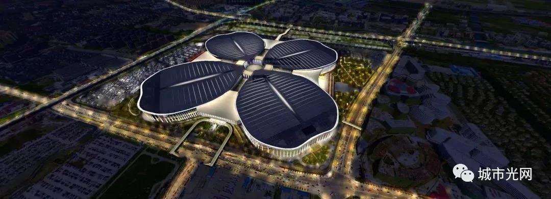 夜幕降临,当来往的航班从国家会展中心的上空飞过,可以看到四叶草的叶片、叶脉、叶茎在灯光的渲染下层次分明、生机盎然。