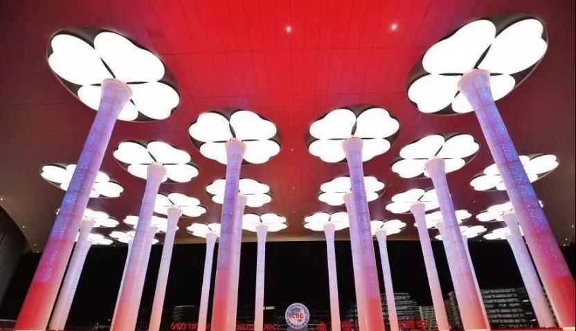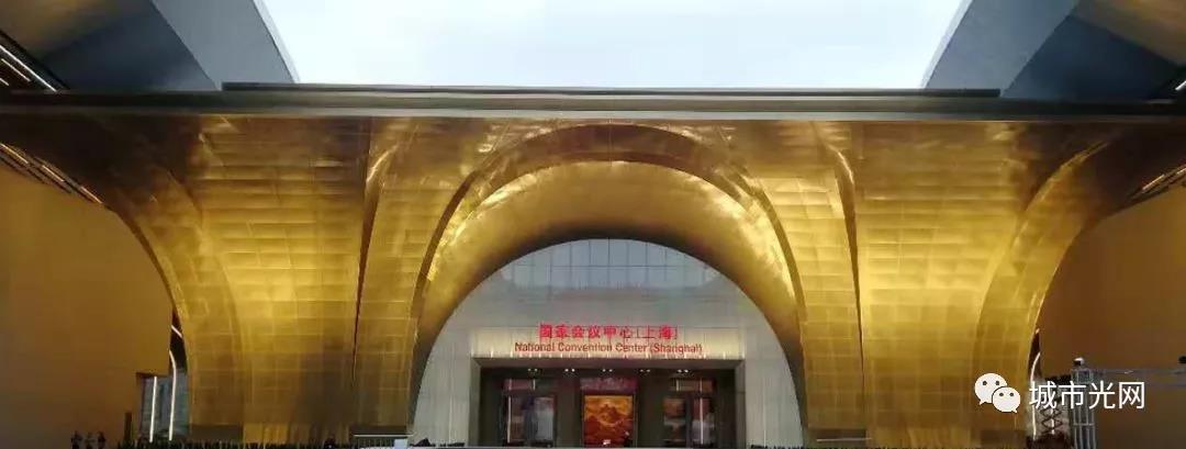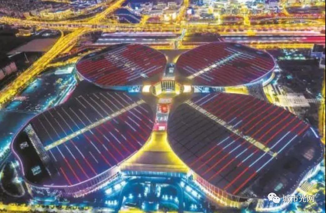 白天的国家会展中心色彩缤纷,夜晚的场馆也因为灯光艺术效果提升而更具韵味。