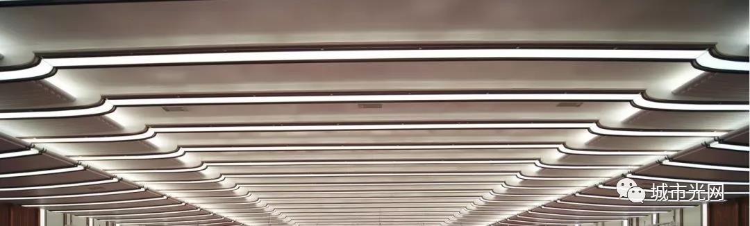 “芯”,在横梁格栅侧壁加装线性灯具,通过间接光的方式提供柔和的泛光表达,增强“叶茎”立体厚度; “脉”,灯具倒扣安装,不仅提高了