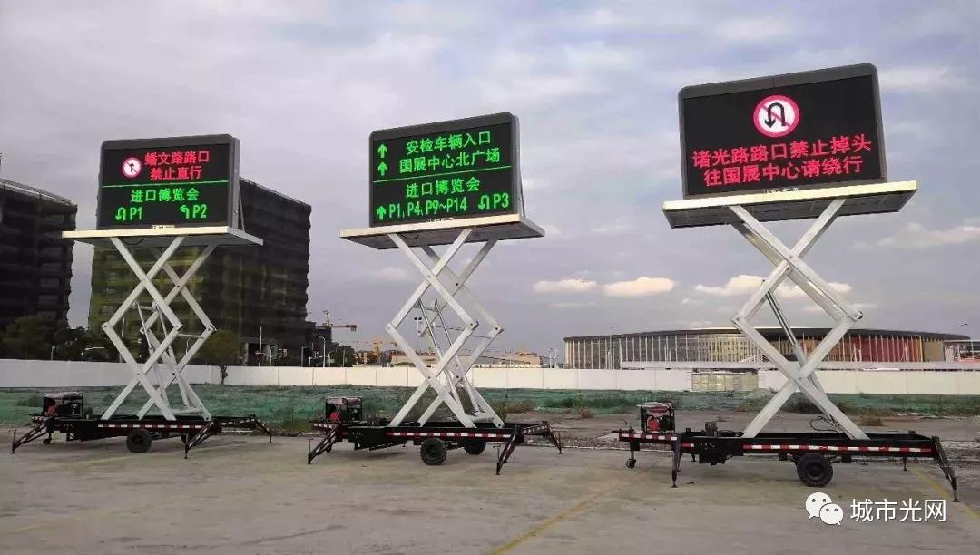除了新型“多杆合一”外,上海市交委还对进博会周边道路采用了另一项创新科技LED产品——多功能交通诱导屏,来保障交通畅通。