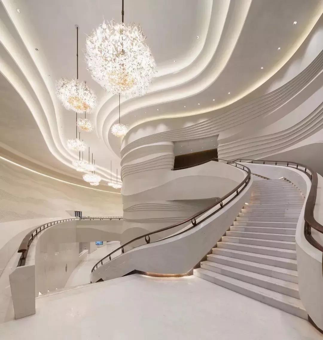 为平面护栏定制LED双面出光灯具,垂直面照亮大平台的护栏,平面勾勒出平台的曲线变化。 主入口天花使用金卤筒灯,满足功能需求 。