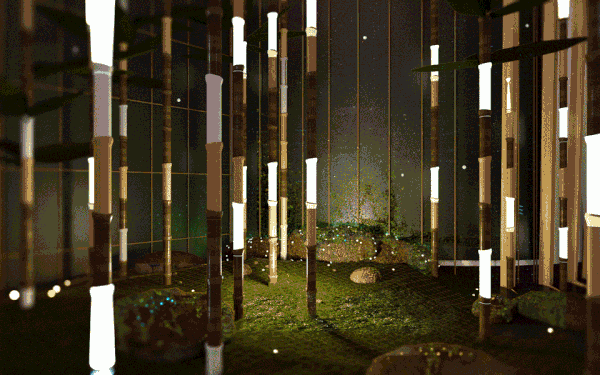 这里面有一个互动的竹林。只有天然材料被用来创造它:竹干,石头和活苔藓。