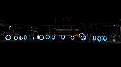 设计师在这个充满艺术气息的广场上,将20个LED发光的圆环形秋千