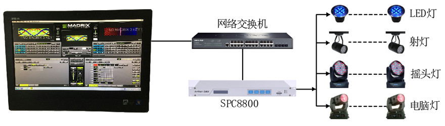 SPC-8800控制器是我公司最新推出的一款世界先进的专业舞台灯光和LED灯光控制系统。SPC-8800灯光控制器可实现计算机网络联机同步播放、无线WIFI联机播放、SD卡脱机场景播放(ARTNET录制模式)。