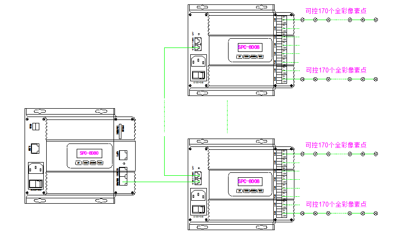 SPC-8008是本公司针对大规模LED控制系统而特别设计的一款联机控制器。SPC-8008采用32位高速DSC处理器,使灯光场景的过度更加细腻柔和,系统的稳定可靠性得到充分的保证。配合功能强大的视频编播软件DMX-NET ,可控制规则,异形等各种点、线、面光源。