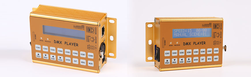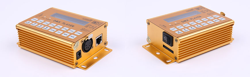 SPC-1000 is an offline DMX512 player specially designed for small LED control / demonstration systems. SPC-1000 uses 32 bit high speed ARM processor to make the scene of the lighting more subtle and soft, and the stability and reliability of the system are fully guaranteed. By reading the MMC/ SD card storage scene files, you can easily text, FLASH animation, video, images and other media information in the art of lighting environment.