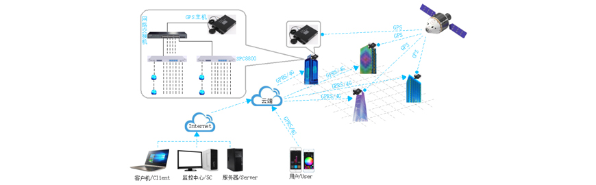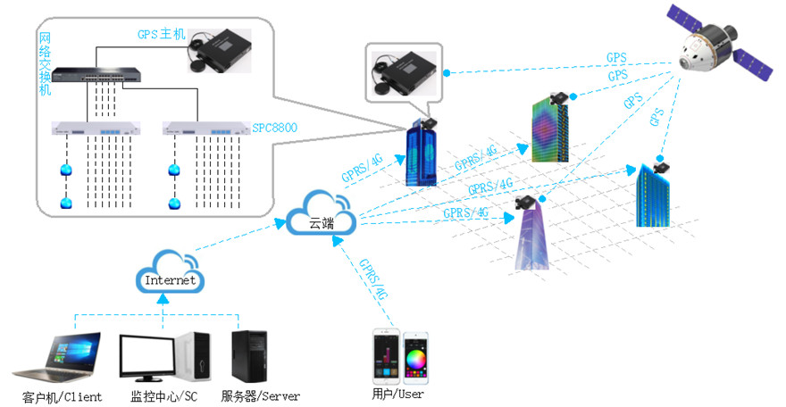 系统由GPS主机+网络交换机+SPC8800+云端服务器+PC客户端/手机客户端