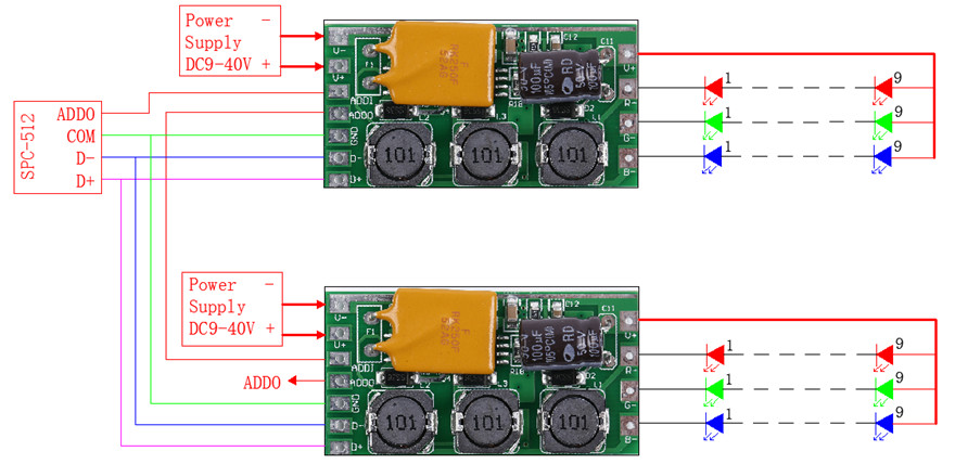 2. Ultra wide range of DC power supply, DC9-40V, efficiency up to 90%, 1-9 series high-power LED, support total output.